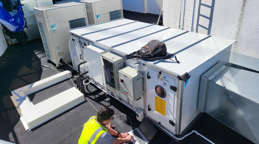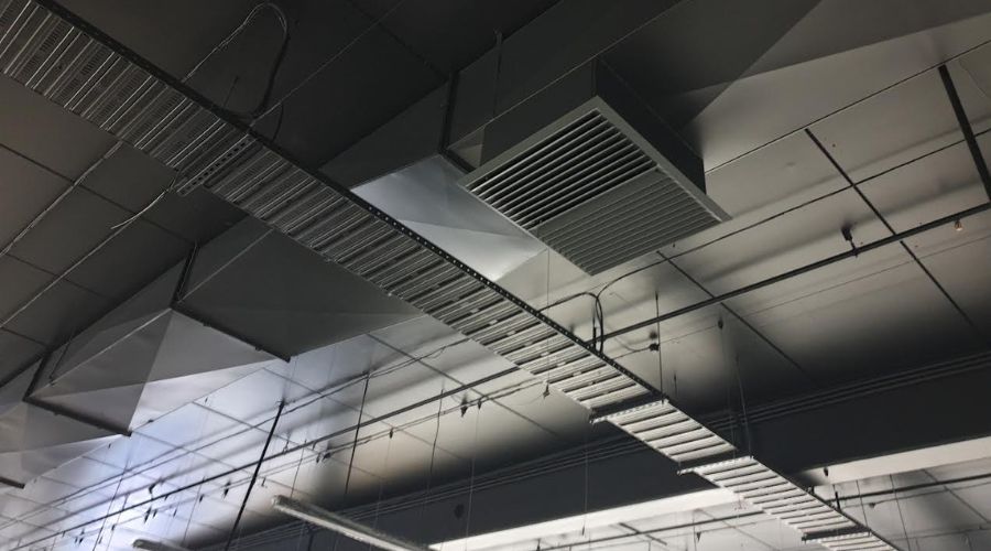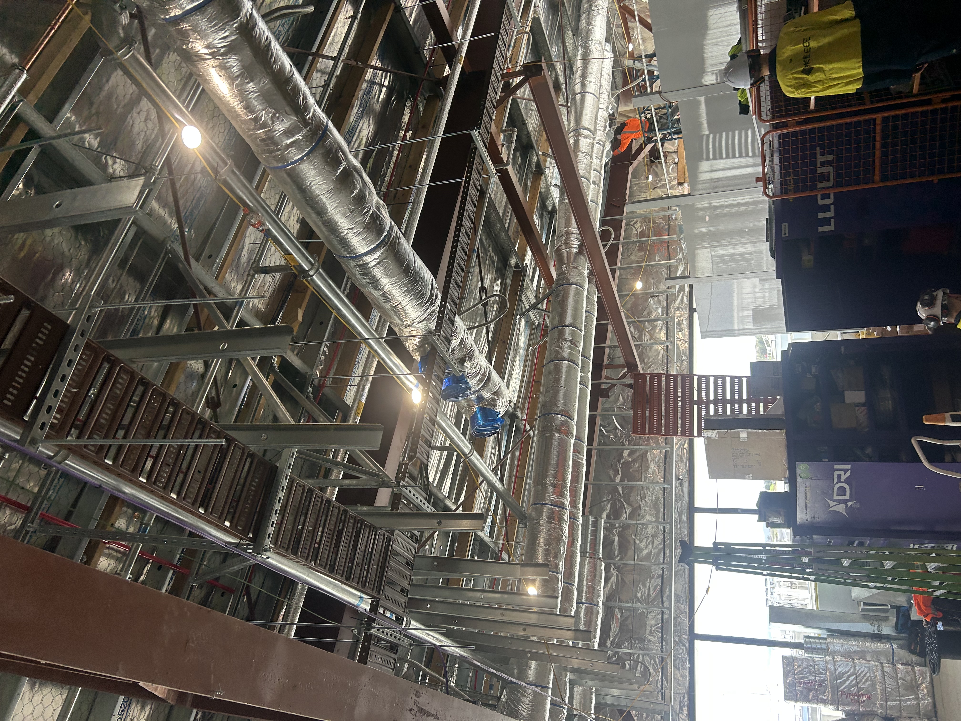 Within the commercial kitchen, insulated galvanised ductwork up to 600 × 450 in size was installed, incorporating KEF extract systems to manage high heat and contaminant loads. A Mitsubishi Electric ICT room hi-wall air conditioning unit was also installed to maintain stable cooling for critical communications infrastructure.