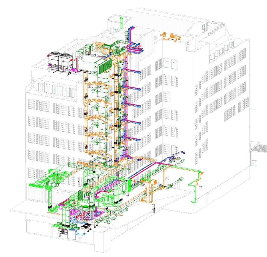 The office and retail building now operates on a highly efficient mechanical system, featuring two 770kW chillers, a 4.4MW cooling tower, and a central air handling unit providing fresh, conditioned air to every floor. By fully modelling the project in Revit during construction, and maintaining clear and consistent communication with our partners, the works were carried out precisely as planned and were delivered on time and within budget at each stage.