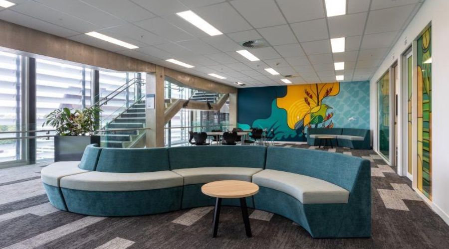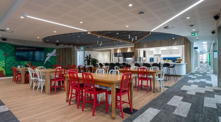 The HVAC system integrates with an existing central air handling unit, providing efficient climate control throughout the lounge. Insulated supply and return ductwork, balancing dampers, and fire and smoke dampers were installed in compliance with AS 1668.1 and NZS 4219 seismic restraint requirements. Heating coils with BMS-controlled thermostats ensure occupant comfort and energy efficiency.